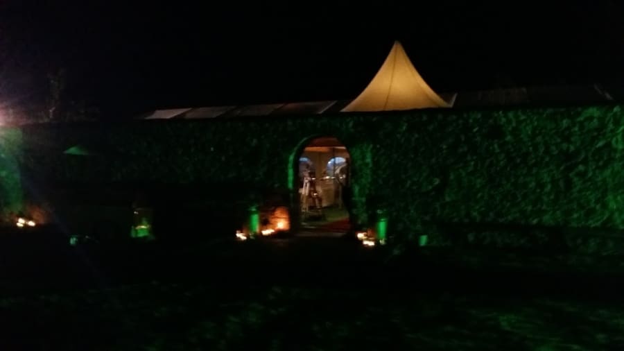 In winter, highlighting outdoor features which are visible from inside the venue works brilliantly. In the warmer months, outdoor lighting can be used to create atmosphere on patios, balconies or on the lawn of the marquee. Features like trees, balustrades, walls and pagodas are idea for feature lighting with flood lights, fairy lights and candlelight.