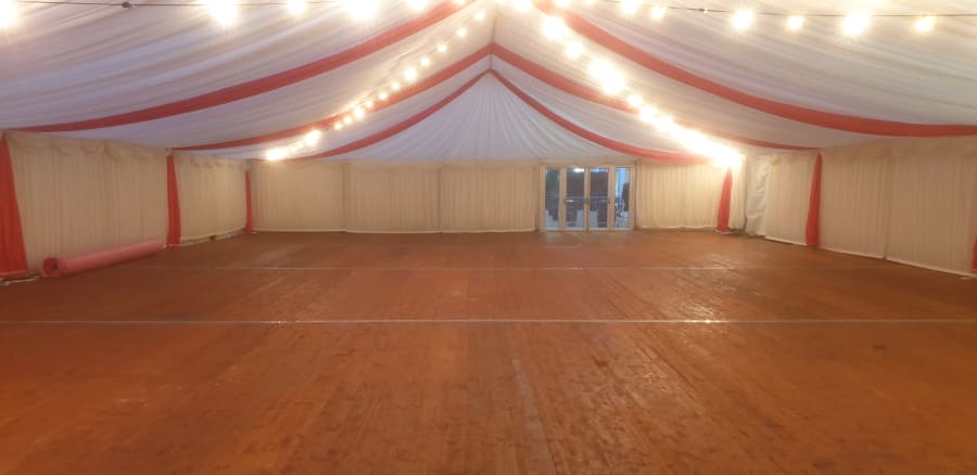 Pleated Ivory linings provide a pleasing traditional finish inside your marquee. Normally associated with weddings they are nonetheless popular at many different types of event. The Ivory linings provide a neutral backdrop against which the more glamorous aspects of your interior can be added.Coloured swags and valance can be used to add colour as well as overlays across the roof.